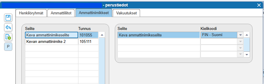 Ammattinimike-kentässä käytettävät nimikkeet perustetaan Palkansaajat > Palkanlaskennan henkilöt > Perustiedot > Ammattinimikkeet-välilehdellä. Ammattinimikkeiden koodien tulee olla oikein, jotta ilmoitusta ei hylätä tulorekisterissä. Kentässä oleva ammattinimike lähetetään vain, jos palkanlaskennan perustiedoissa on valittuna joku muu koodisto kuin TK10. Kevan ammattinimikkeet löytyvät tästä linkistä avautuvalta sivulta.