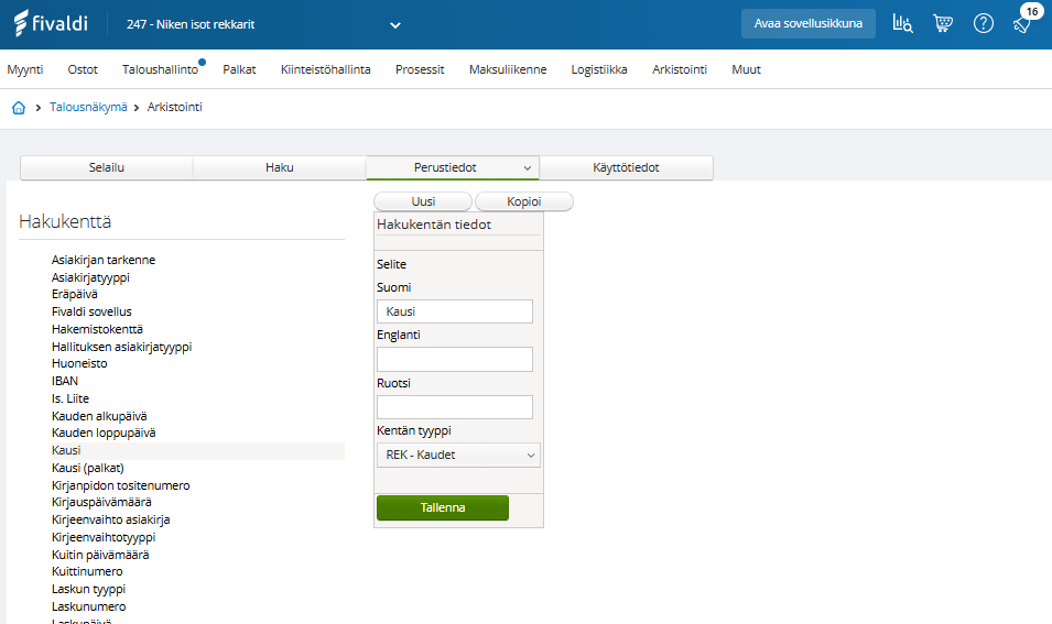 Arkistoon tuodaan valmiiksi Fivaldin omiin raportteihin tarvittavat hakukentät. Käyttäjä voi itse luoda tarvitsemiaan hakukenttiä ulkoisille aineistoille. Hakukenttiä ei voi poistaa.