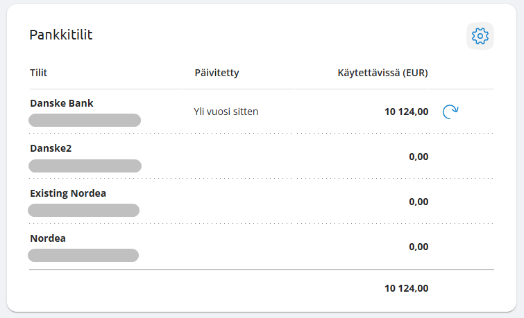 Yrityksen pankkitilit -widgetissä näet yrityksen pankkitilit, saldot, mahdollisen limiitin sekä tietojen päivitysajan. AutoPayhin aktivoitujen tilien saldon voit päivittää napsauttamalla sinistä mutkanuolipainiketta.