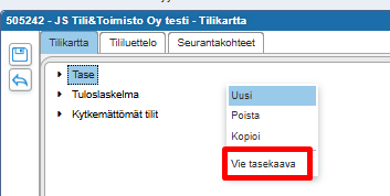 2. Klikkaa Tilikartta-välilehdellä hiiren oikeaa näppäintä ja valitse Vie tasekaava. Tiedosto tallentuu tietokoneellesi ja sen oletusnimi on muodossa fv+yritysnumero_tilipuitteen numero_tasekaava.tkt