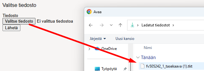 5. Tiedoston valintanäkymä avautuu uuteen välilehteen. Älä sulje sitä välilehteä, jossa Tilikartan Tilipuite-välilehti on auki.Napsauta Valitse tiedosto, etsi äsken lataamasi tilikarttatiedosto ja valitse se tuplaklikkaamalla.