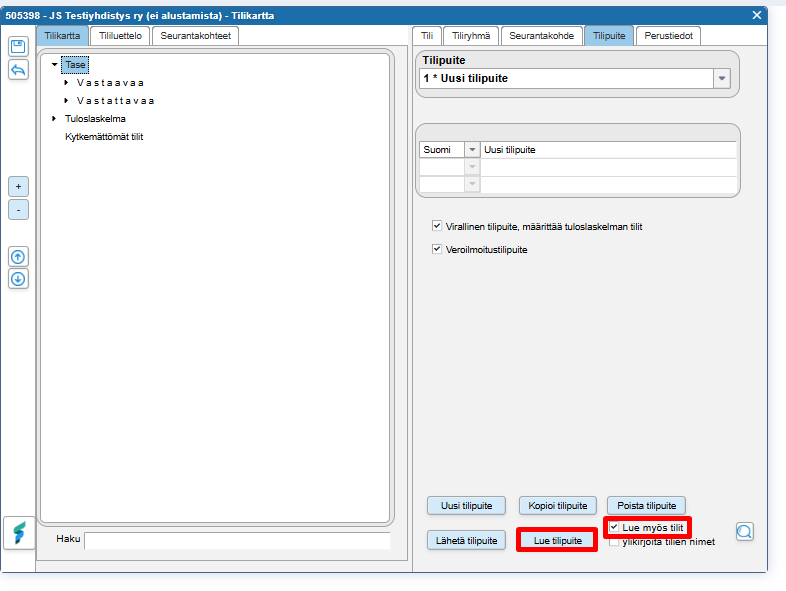 8. Siirry takaisin siihen välilehteen, jossa Tilikartan Tilipuite-välilehti on auki. Valitse ruksi kohtaan Lue myös tilit ja napsauta Lue tilipuite -painiketta. Odota, että lataus valmistuu ja kuittaa lopuksi ohjelman antamat ilmoitukset.