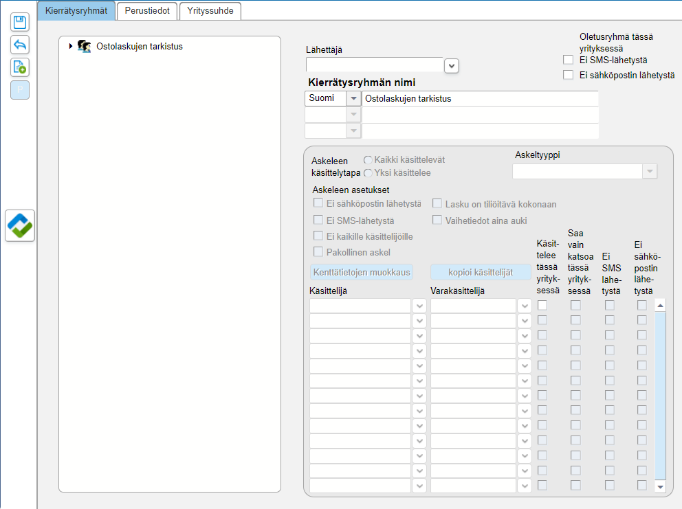 Ei SMS lähetystä -valinta | Asetus määrittelee, lähetetäänkö askeleella SMS käsittelyssä olevista laskuista. Mahdollista määritellä myös käyttäjäkohtaisesti. |