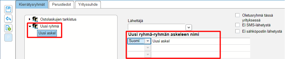 Huom! Kierrätysryhmän nimi on annettava vähintään suomeksi. Jos ryhmän jonkin askeleen käsittelijä käyttää Fivaldin englanninkielistä versiota, tulee kierrätysryhmälle antaa nimi myös englanniksi.