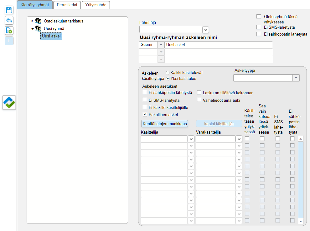 Askeleen käsittelytapa | Kaikki käsittelevät: Mikäli askeleessa on useita käsittelijöitä, täytyy jokaisen kyseisen askeleen käsittelijän käsitellä lasku, ennen kuin lasku siirtyy seuraavan askeleefn käsiteltäväksi. Yksi käsittelee: Mikäli askeleessa on useita käsittelijöitä, riittää että yksi käsittelijä käsittelee laskun, jolloin lasku siirtyy seuraavan askeleen käsiteltäväksi. |