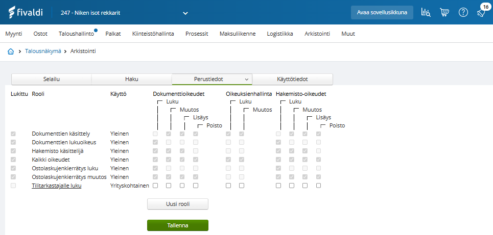 - Arkistossa määritetään käyttäjätunnuksille ja käyttäjäryhmille oikeuksia roolien kautta. Rooli määrittää mitä arkiston hakemistolle tai dokumentille voi tehdä. Lukittuja rooleja ei voi poistaa.