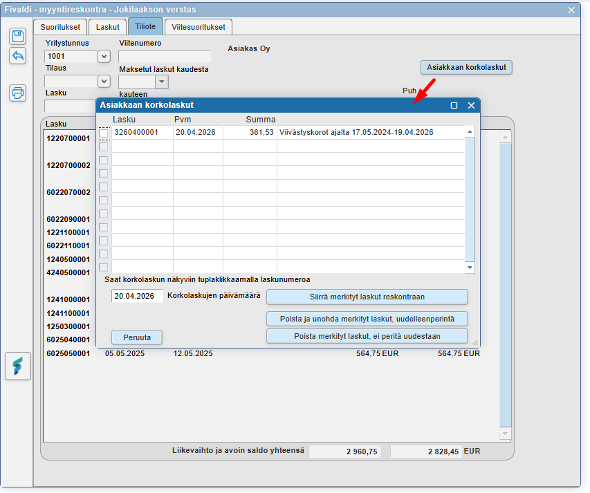 Jos korkolasku on ajettu suoraan myyntireskontraan, se näkyy ajon jälkeen Myyntireskontran Tiliote-näkymässä ja sitä voidaan käsitellä kuin mikä tahansa laskua.