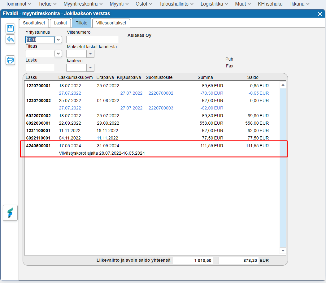 - Siirrä merkityt laskut reskontraan -painike: Siirtää ruksilla valitut korkolaskut reskontraan (esim. tilanne kun asiakas on maksanut koron tai korkolaskua halutaan karhuta ja/tai käsitellä reskontran laskuna). Siirron jälkeen 3-alkuinen korkolaskuehdotus muuttuu 4-alkuiseksi korkolaskuksi ja näkyy asiakkaan avoimissa laskuissa normaalisti. Tämän jälkeen saat alkuperäisestä korkoehdotuksesta laskukopion vain Fivaldin raporttien kautta: Tarkista Tiliote-välilehdeltä korkolaskun alkuperäinen numero ja tulosta tilaustenkäsittelyn laskuraporteilla tästä laskunumerosta kopio.