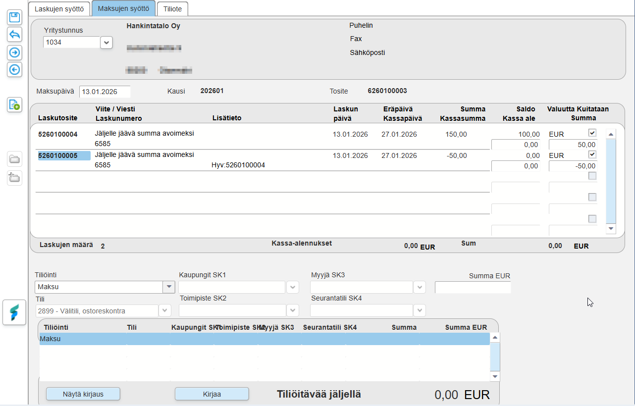 - Valitse oikea tiliöinti, klikkaa Summa EUR -kenttään ja tarkista että siihen tulee nolla.