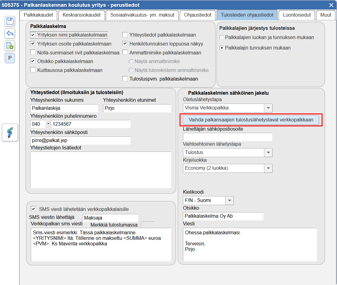 - Yrityksen palkkalaskelmien oletuslähetystapa muutetaan Visma Verkkopalkaksi.