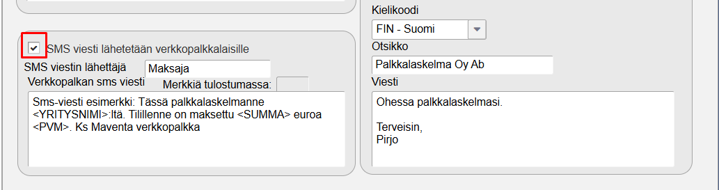 - Poista valinta SMS-viesti lähetetään verkkopalkkalaisille ja tallenna.