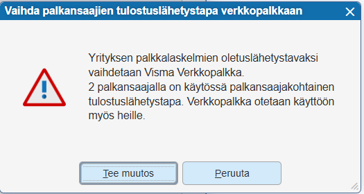 HUOMIOI: Vaikka Vaihda palkansaajien tulostuslähetystavat verkkopalkkaan -painike muuttaa myös palkkalaskelmien sähköisen jakelun yrityskohtaisen oletuslähetystavan Visma Verkkopalkaksi, se ei tarkista onko oletuslähetystapaa käyttävillä palkansaajilla Visma Verkkopalkan vaatimat tiedot perustiedoissa. Tarkistus tehdään vain palkansaajille joiden palkansaajakohtainen lähetystapa on ollut sähköposti.