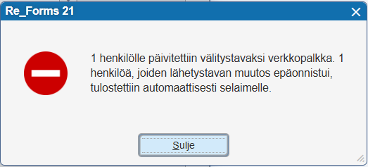 Kun lähetystavan vaihtaminen on suoritettu loppuun, näyttöön aukeaa ilmoitusikkuna. Ilmoituksessa kerrotaan kuinka monelle palkansaajalle muutos tehtiin ja kuinka monelle muutos jäi tekemättä. Samalla selaimeen aukeaa listaus henkilöistä, joilla palkansaajakohtainen palkkalaskelman lähetystapa oli “Tulostus” tai “Poistettu” ja joille yritettiin vaihtaa uudeksi lähetystavaksi Visma Verkkopalkka, mutta palkansaajan tiedot olivat verkkopalkan käyttöönoton kannalta puutteelliset. Ohjelma tarkisti seuraavat asiat palkansaajakohtaisen lähetystavan vaihtamisen yhteydessä: