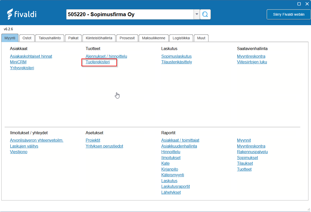 Sopimuslaskutuksen tuotteet tallennettaan Sovellusikkunan Tuoterekisterin kautta