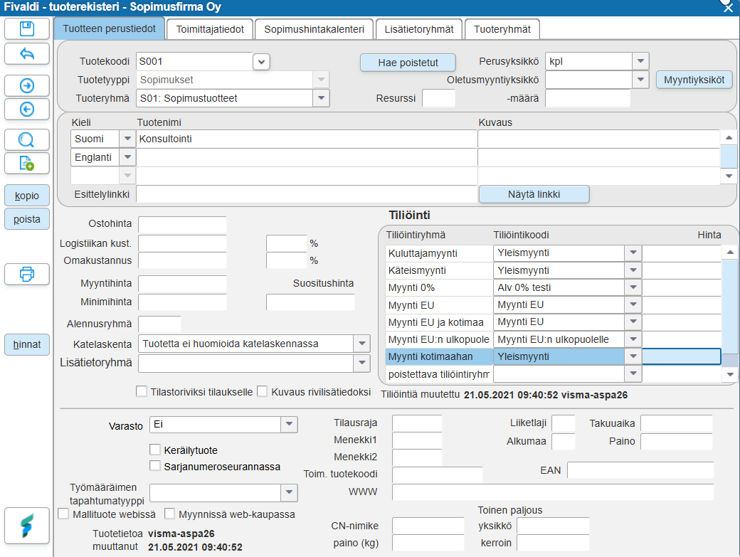 Tuoterekisteri / Tuotteen perustiedot / Tiliöintikoodi