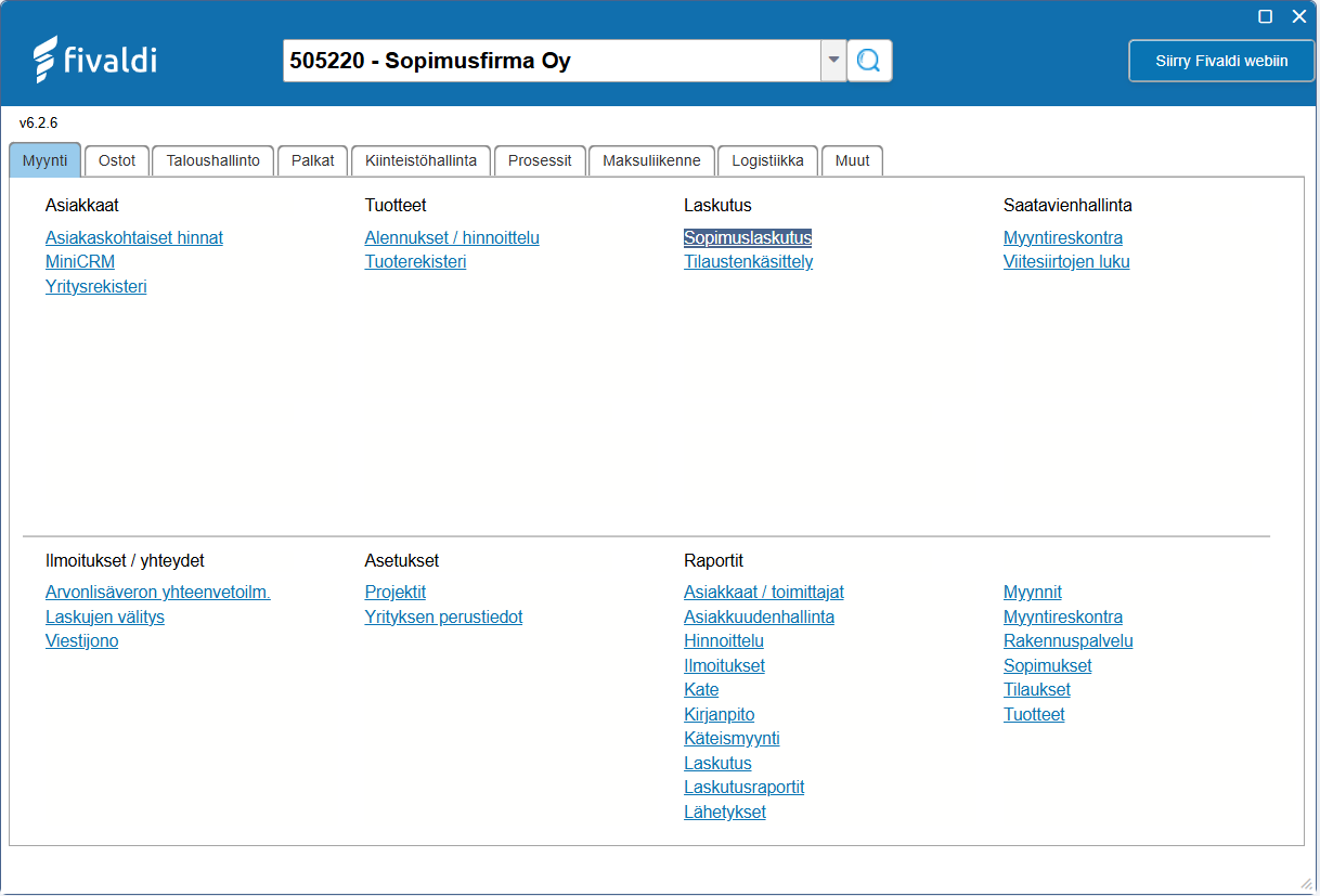 Sopimuslaskutus löytyy Sovellusikkunasta Myynti -välilehdeltä