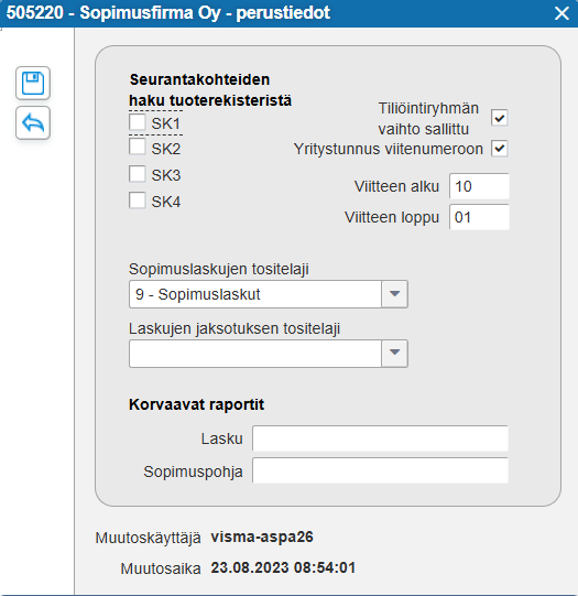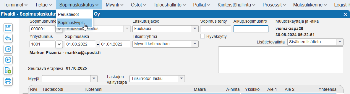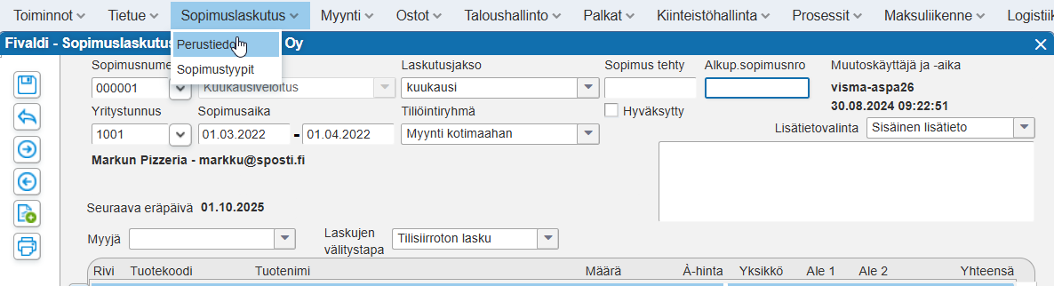 - Avaa Sopimuslaskutus, ylävalikosta Sopimuslaskutus -> Perustiedot