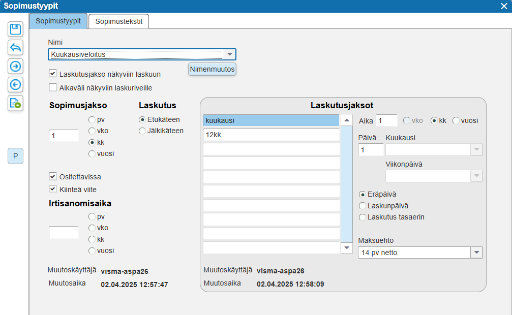 Laskutusjaksot = voit määritellä sopimustyypille niin monta laskutusjaksoa kuin on tarpeellista. Esimerkiksi Kuukausi.