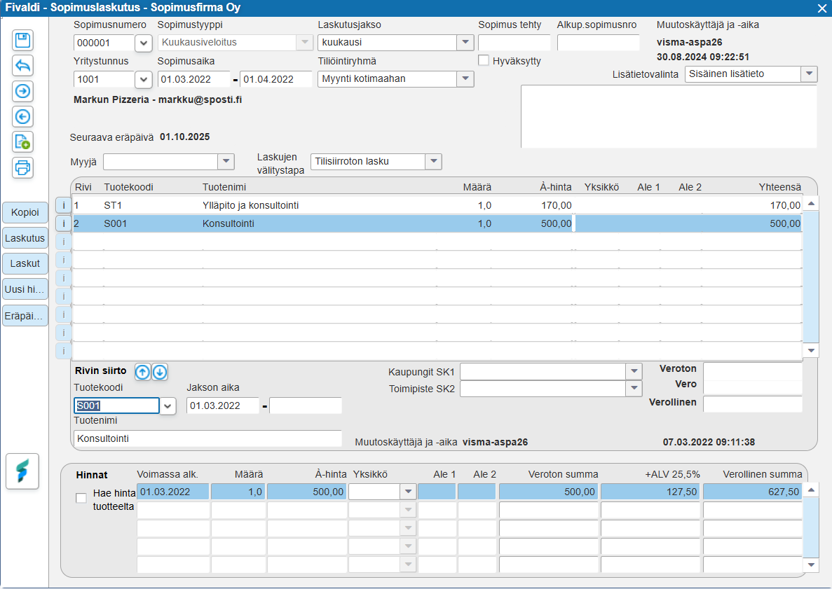 Tallennetut sopimusrivit näkyvät ruudun keskiosassa, jolloin yhteensä riville loppusummaksi