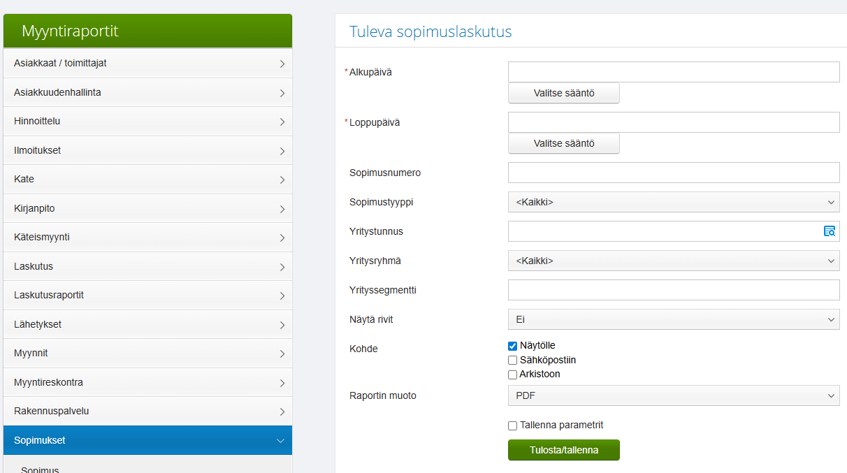 Tuleva sopimuslaskutus = Tulostaa tulevan ajan tietyn jakson summat sopimustyypeittäin (esim. budjetoinnin