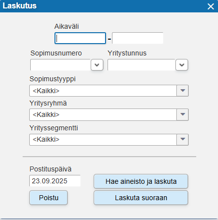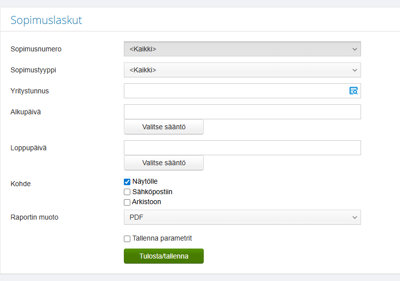 Sopimusnumero = tallennetaan vain jos halutaan ajaa ulos vain tietyn sopimuksen lasku. (jos halutaan kaikki ko. ajalta , tämä jätetään tyhjäksi)