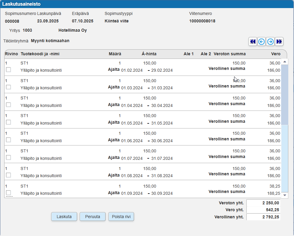 - Esimerkiksi jos laskutusjakso on 1 vuosi, voidaan sopimuslaskun myynti ja alv jaksottaa automaattisesti 12 kuukaudelle