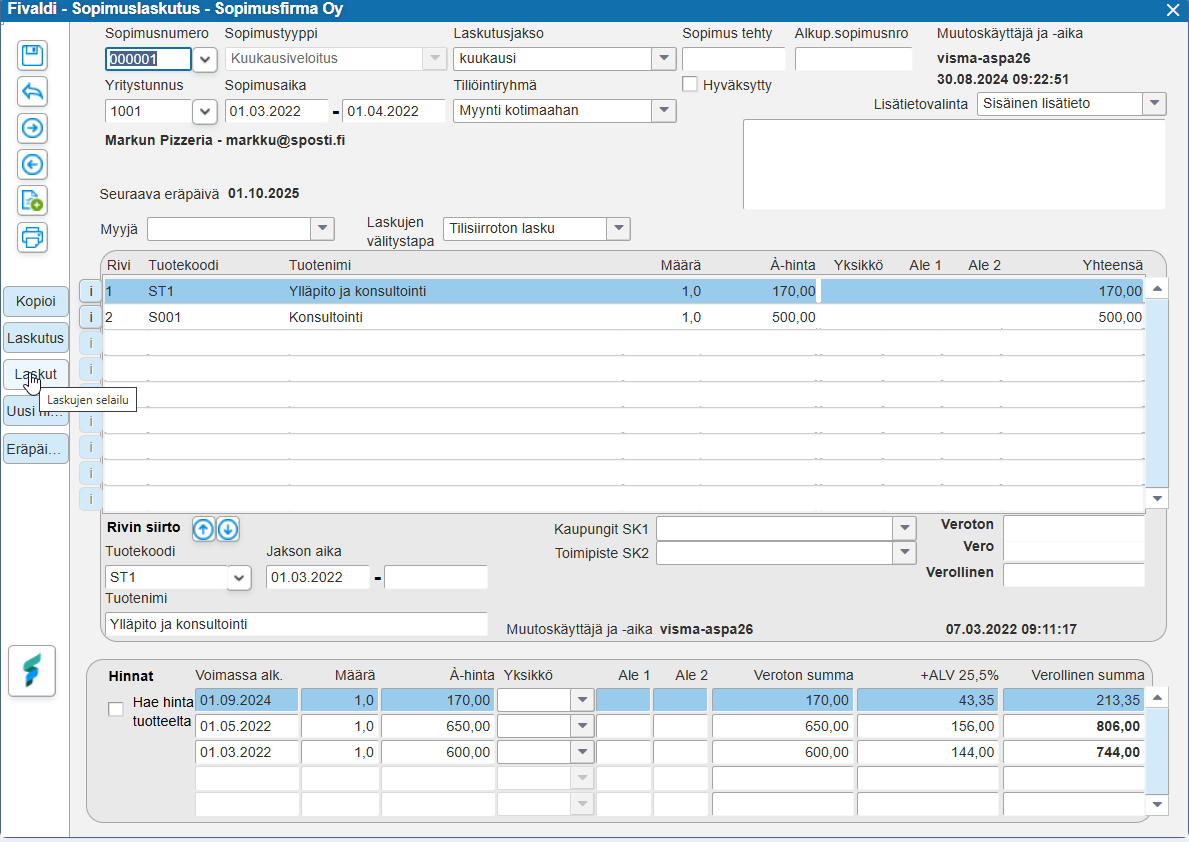 Etsi kyseinen sopimuspohja esille. Paina vasemman laidan painikkeista ”Laskut” (Laskujen selailu).