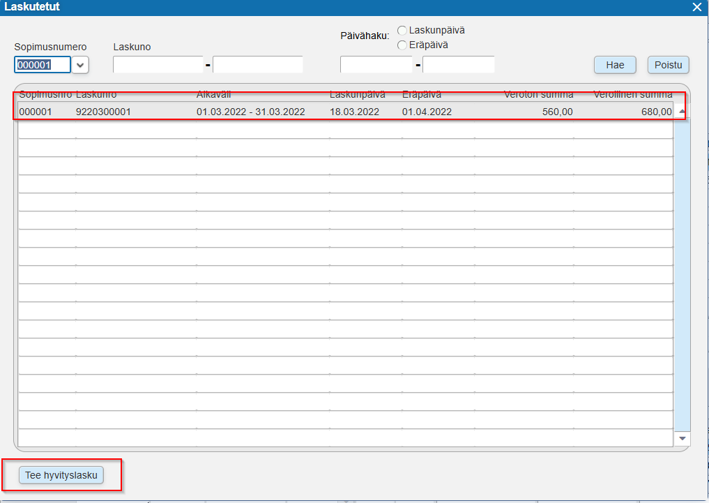 Siirry hyvitettävän laskurivin kohdalle (Huom, hyvityslaskuja voi tehdä ainoastaan