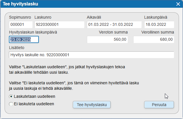 Alla olevassa näkymässä voit tarvittaessa vielä kirjoittaa tekstiä Lisätieto-kenttään. Kentän tiedot näkyvät laskulla Tilauksenne-kohdassa. Huom! Ruudun alhaalla olevaan kohtaan ”ei laskuteta uudelleen ” laitetaan täppä VAIN siinä tapauksessa, että tälle sopimukselle ei tehdä enää yhtäkään hyvityslaskua tai uutta laskua, eli valinta ”ei laskuteta uudelleen” lukitsee sopimuksen jatkolaskutuksen kokonaan. Muussa tapauksessa anna valinnan ”laskutetaan uudelleen” olla päällä ja paina ” Tee hyvityslasku”.