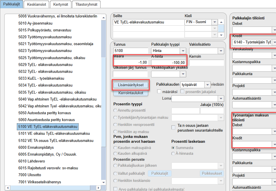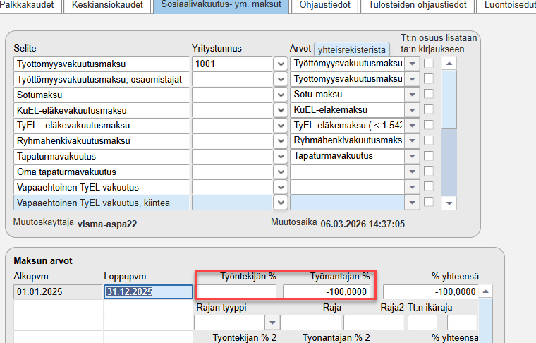 - Työnantajan % -kentän arvoksi -100.