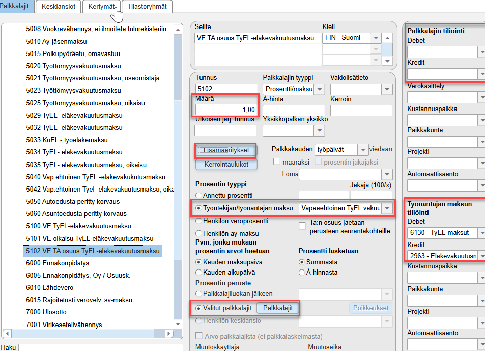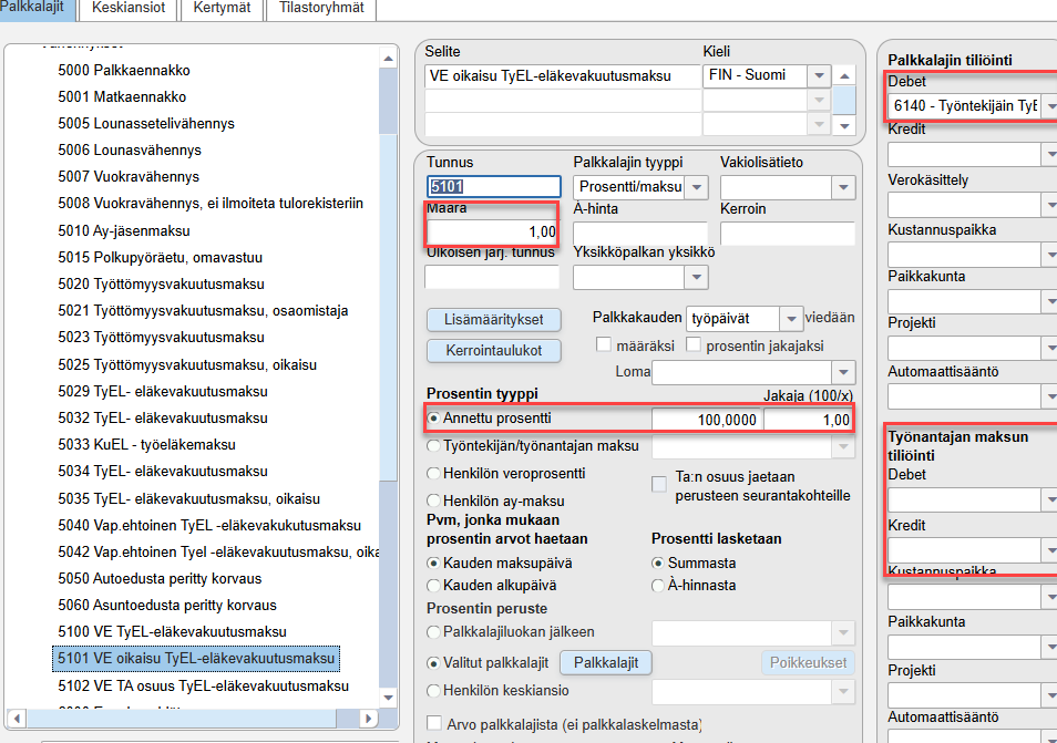 - Valitaan Työntekijän/työnantajan maksu -kohtaan kohdassa 1 perustettu maksuprosentti.