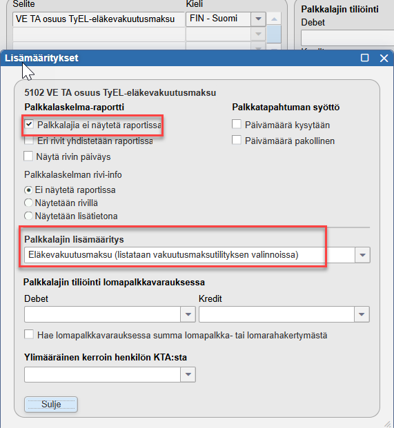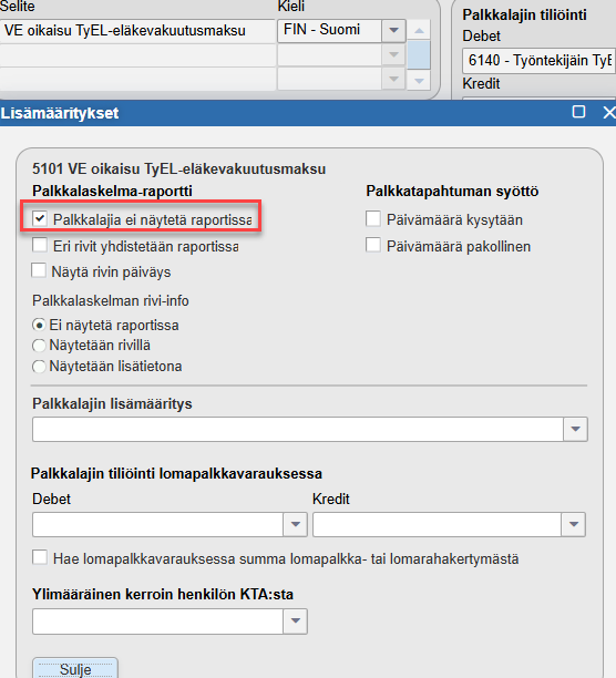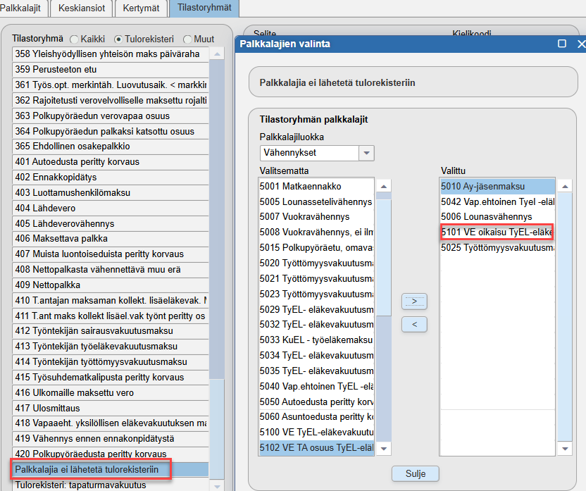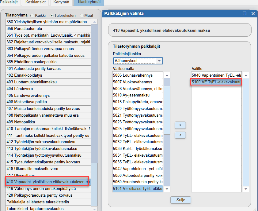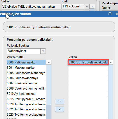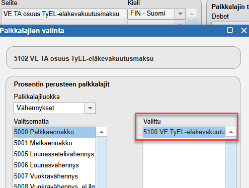 - Valitaan Valitut palkkalajit -kohdassa palkkalajiksi edellisessä kohdassa luotu vapaaehtoisen TyEL-maksun palkkalaji.