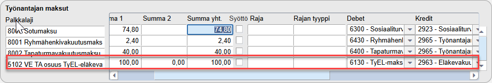 - Valitaan Työnantajan maksun tiliöinti -otsikon alle Debet- ja Kredit-tili.