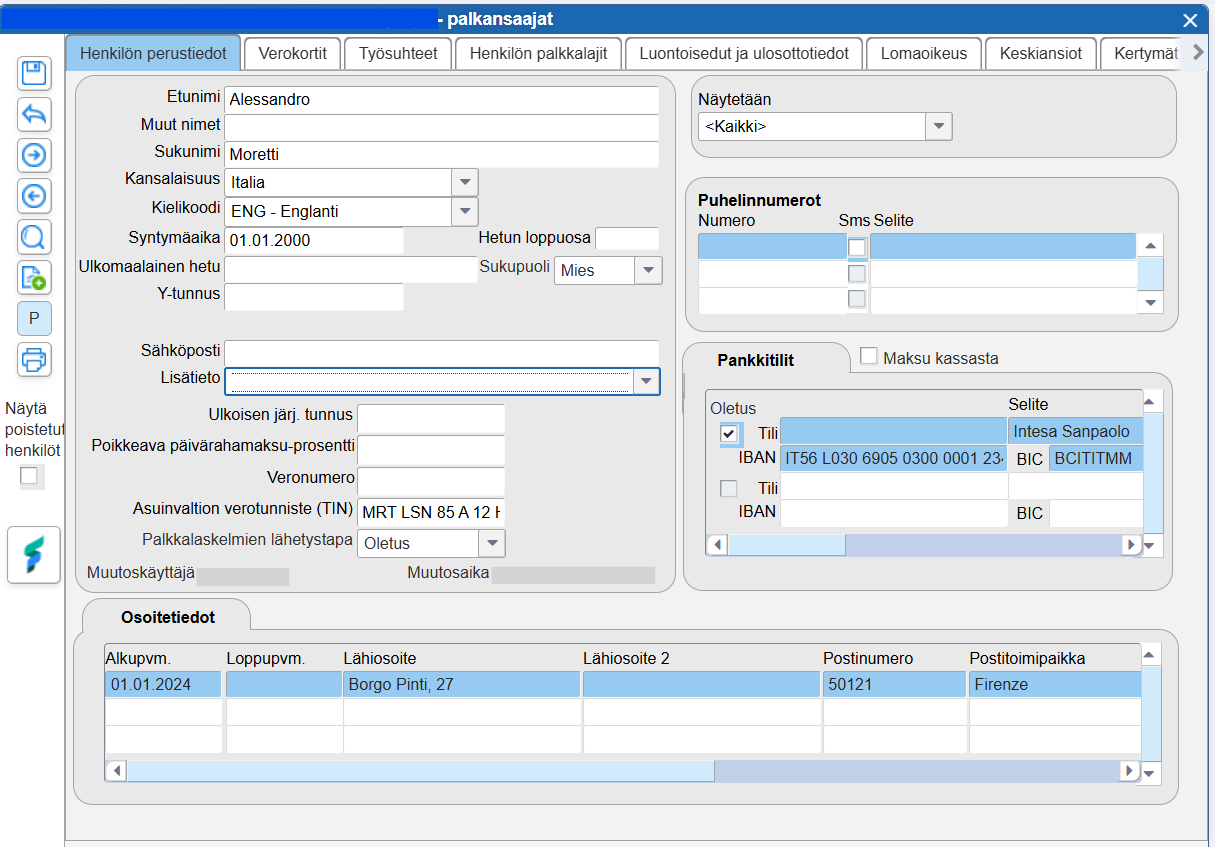 Palkansaajat -rekisterissä Henkilön Perustiedot -välilehdellä syötetään ulkomaalainen henkilötunnus sille varattuun kenttään. Palkansaajalle tulee syöttää myös kansalaisuus, syntymäaika, sukupuoli, ja osoitetiedot sekä TIN-koodi (asuinvaltion verotunniste), mikäli tämä on käytössä kyseisessä maassa.