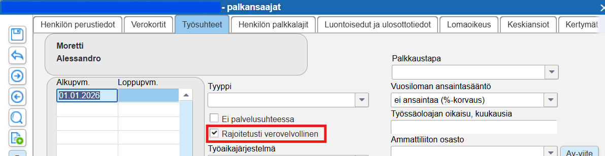 Aseta Työsuhteet-välilehdellä Rajoitetusti verovelvollinen valinta päälle: