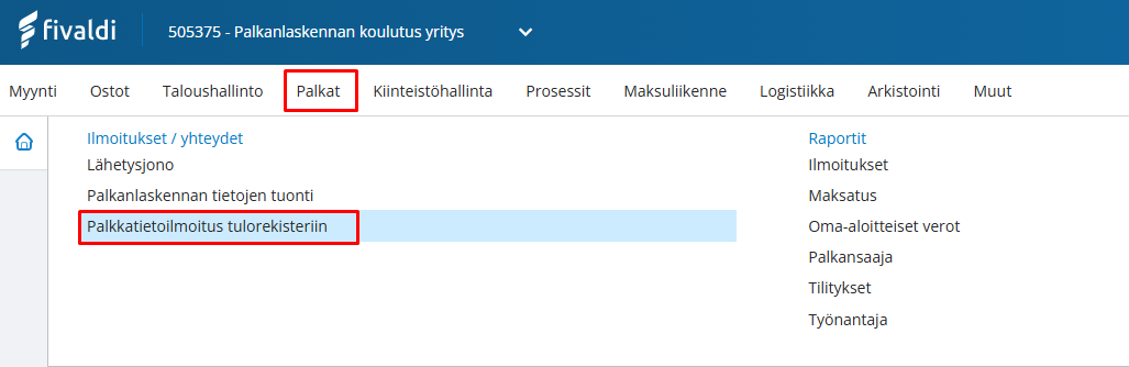 Fivaldissa on selainpohjainen Palkkatietoilmoitus tulorekisteriin -sovellus tulorekisteriin lähetettävien palkkatietoilmoitusten tietojen esikatselua ja tarkistamista varten. Sovelluksella voi tietojen esikatselun lisäksi myös mitätöidä jo lähetettyjä palkkatietoilmoituksia, sekä lähettää ja perua korvaavia ilmoituksia. Palkkatietoilmoitusten lähettäminen tulorekisteriin alkaa 1.1.2019 tai sen jälkeen maksettavista palkoista. Palkkatietoilmoituksen esikatselussa näytetään vain 1.1.2019 jälkeen maksettavien palkkalaskelmien tiedot.