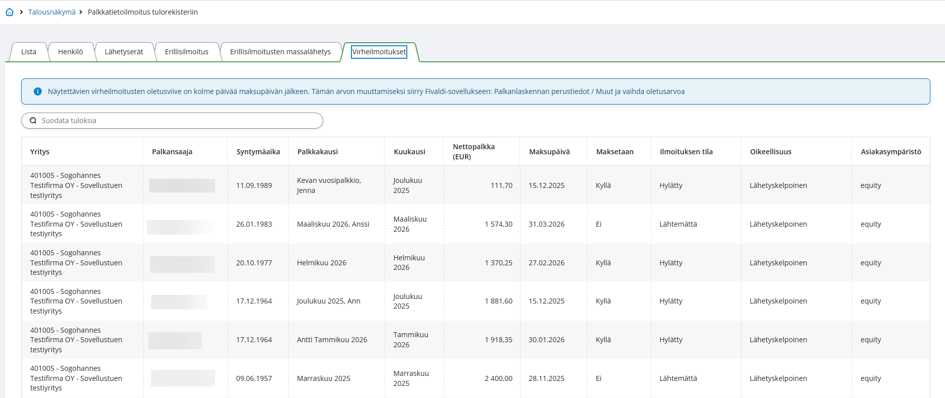 Virheilmoitukset poistuvat näkymästä sen jälkeen kun palkkakausi suljetaan.