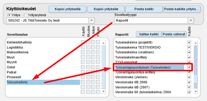 Kierrätyksen laskun liitteeksi viedään raportti Työnantajasuoritukset (Tulorekisteri), jos ostolaskut on otettu käyttöön arkistoasetuksissa. Käyttäjällä tulee myös olla oikeus kyseiseen raporttiin.