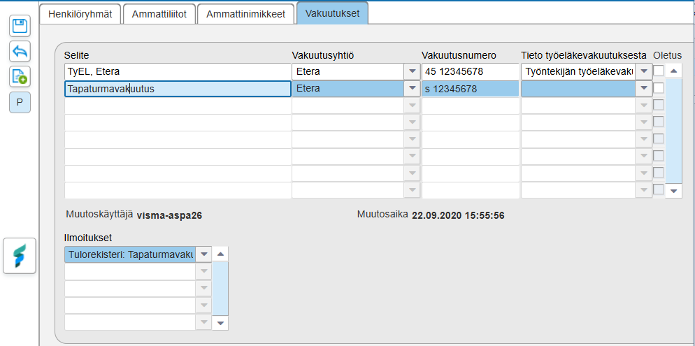 Sovellusikkuna > Palkat > Palkansaajat > ylävalikon Palkanlaskennan henkilöt > Perustiedot > Vakuutukset-välilehdellä on mahdollista määrittää yrityskohtainen ja tulonsaajakohtainen työtapaturmavakuutusyhtiö ja vakuutusnumero.