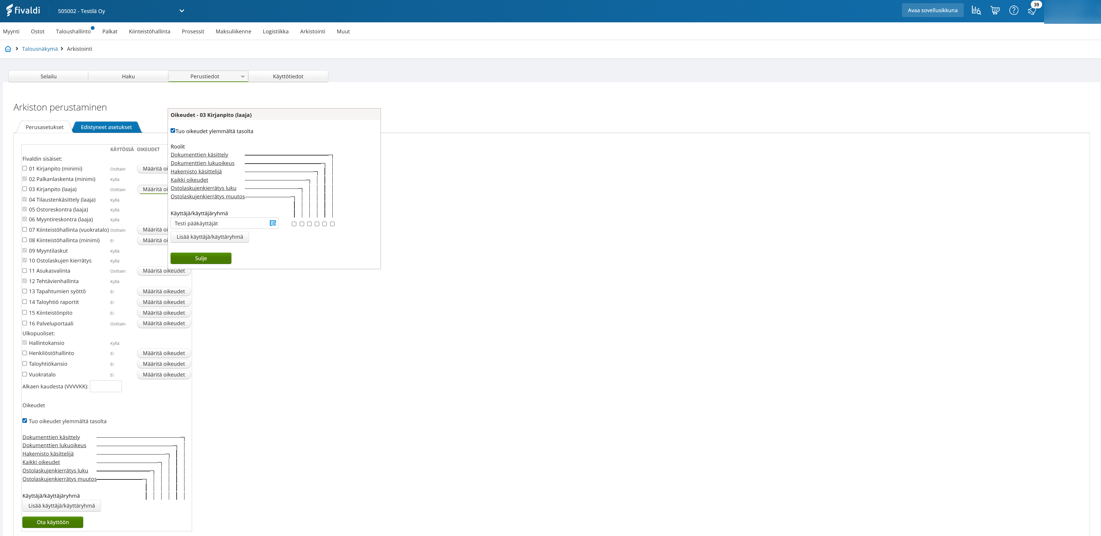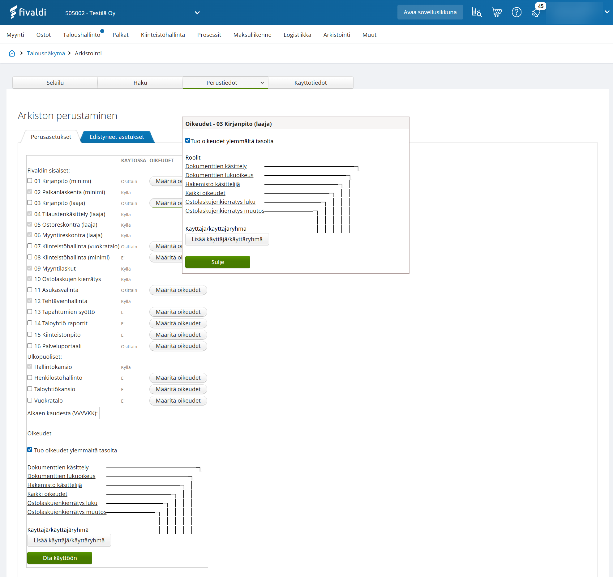 - Alalaidassa lisättävät oikeudet tulee koko perustettavalle arkistoajolle. Tämä oikeus tulee kaikille määrityksien perustamisessa vietäville aineistoille ja raporteille.