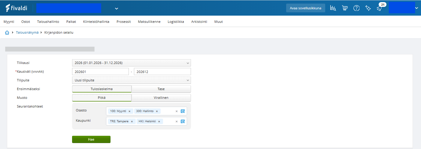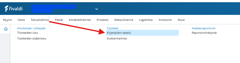 Pääset selailemaan kirjanpidon tositteita Fivaldin Kirjapidon selailu -sovelluksessa (Fivaldi web > ylävalikosta Taloushallinto > Kirjanpidon selailu). Sovelluksessa voit porautua tapahtumatason tietoihin selaimeen tulostetusta raportista.