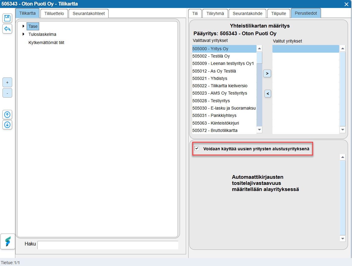 Yhteistilikarttaa tarjoavan yrityksen saa näkymään alustuksessa, kun yhteistilikarttayrityksen tilikartan perustiedoissa Tilikartta-välilehdellä on valittu kohta ”Voidaan käyttää uusien yritysten alustusyrityksenä”. Yhteistilikartta voi olla alustusyrityksessä tai erillisessä yrityspaikassa.