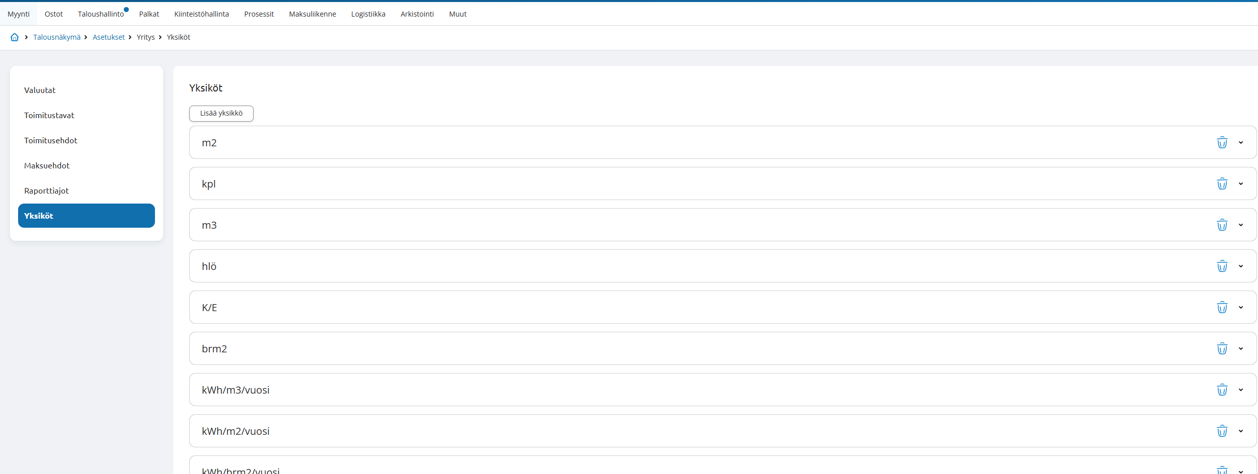 Poista yksikkö napsauttamalla roskakoripainiketta ja napsauttamalla sen jälkeen Tallenna-painiketta. Poisto on estetty, jos kyseinen yksikkö on tallennettu Tuoterekisterissä tuotteen oletusyksiköksi tai jos yksikkö on varasto- tai kiinteistöhallintasovellusten käytössä.