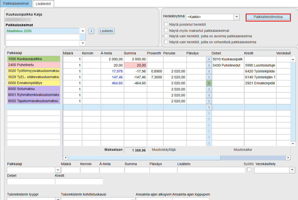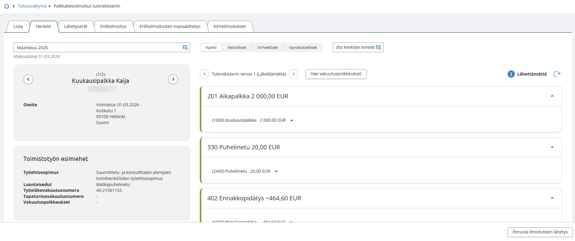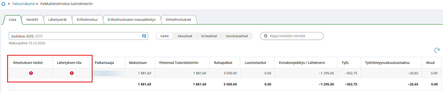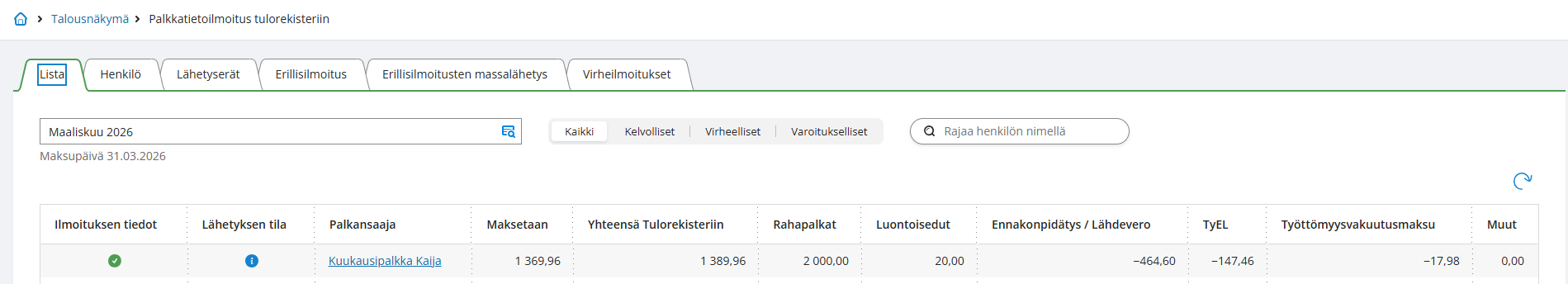 - Tarkista Lista- ja Henkilö-näkymissä, että ilmoituksen aineisto on kunnossa. Tämä on hyvä tehdä vähintään silloin, jos palkkakaudella on lisätty uusia tulonsaajia tai palkkalajeja, jos palkkalaskelmalla on poikkeavia tilanteita tai mikäli ollaan lähettämässä korvaava ilmoitus. Jos olet tehnyt korjauksia aiemmille palkkakausille, tarkista sekä nykyinen palkkakausi että korvaavan ilmoituksen palkkakausi.