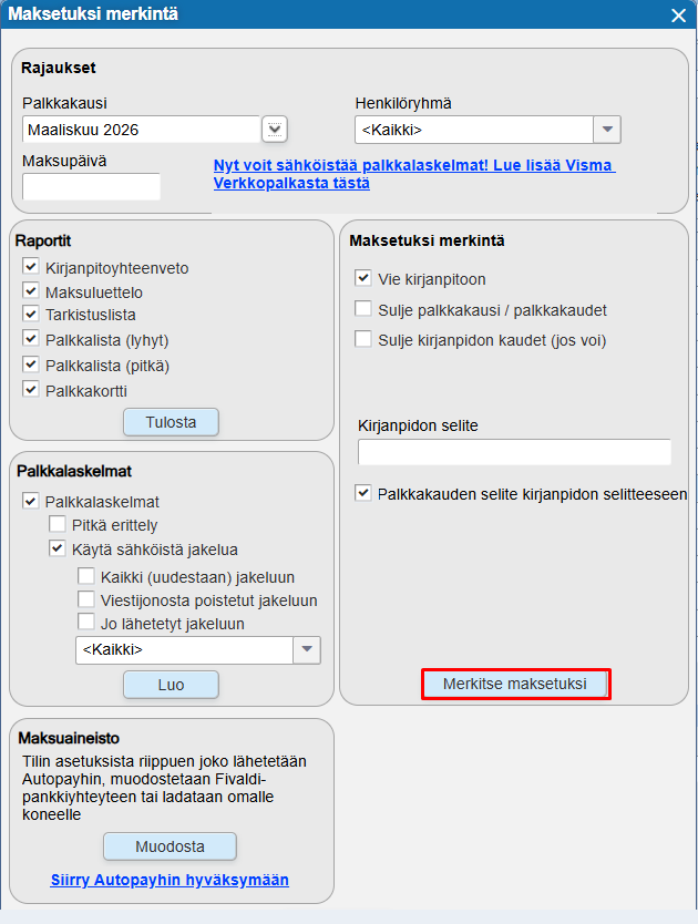 - Kun palkkojen maksuerä on lähtenyt tililtä, tehdään kyseisen palkkakauden maksetuksi merkintä (yläpalkista Palkanlaskenta > Maksetuksi merkintä). Katso myös kohta Palkkojen merkitseminen maksetuksi ohjeessa Palkanlaskennan rutiinit.