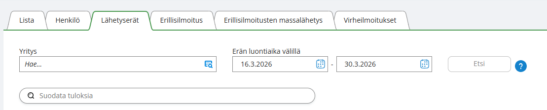 Voit tarkistaa palautteen Lähetyserät-välilehdeltä Erän tila -sarakkeesta. Huomioi, että Erän tila voi olla Hyväksytty, vaikka osa henkilöistä olisi hylätty; tarkista siksi aina myös Lista-välilehti.