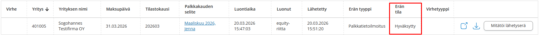 - Erän tila on Hyväksytty, jos aineistossa on vähintään yhden henkilön hyväksytty ilmoitustieto. Erä saattaa silti sisältää yhden tai useamman palkansaajan hylkääntyneen ilmoitustiedon. Tarkista asia Lista-välilehdeltä.