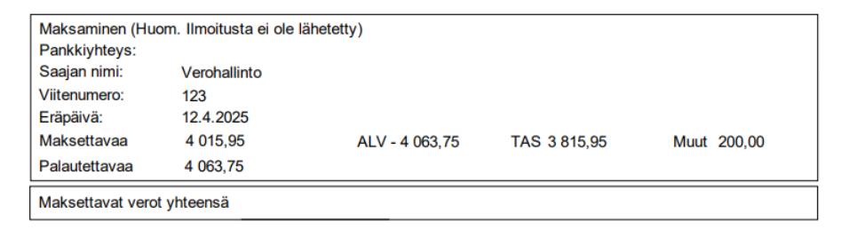 HUOMIOI: Ilmoituksen ylätunnisteessa pitää lukea Ilmoitettu verottajalle, päivämäärä ja kellonaika ennen kuin maksetaan pankkiin tätä kohdekautta ja ilmoituskertaa koskeva vero. Yritykselle tallennetut ilmoituksen perustiedot, eri verolajien summat ja yhteenlaskettu kaikkien verojen summa näkyvät ylläolevan esimerkkikuvan mukaisesti laatikossa.