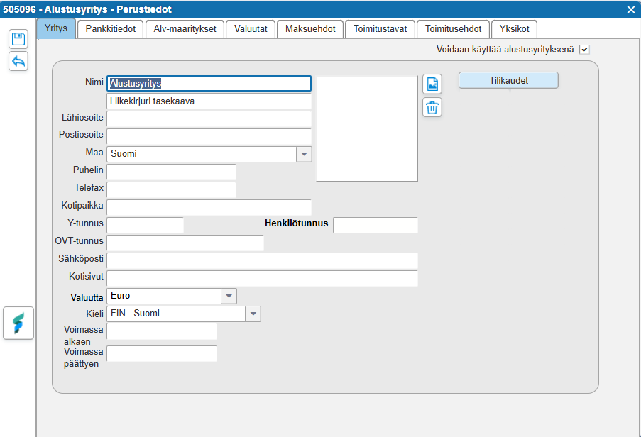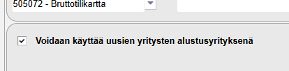 Tilikartan Perustiedot-välilehdellä valitaan valintaruutu Voidaan käyttää uusien yritysten alustusyrityksenä:
