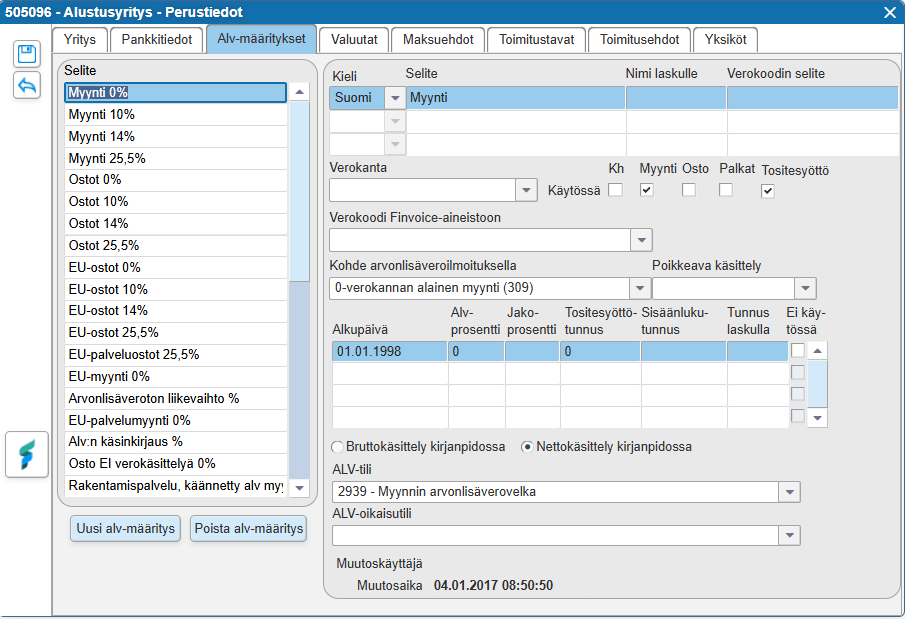 Laskujen tiliöinti -välilehdellä perustetaan vain ne tiliöinnit jotka ovat yleisesti/yhteisesti käytössä kaikille kyseisen alustusyrityksen mukaan alustettaville yrityksille: